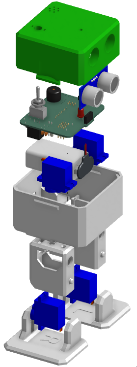 Conçue sur mesure au MakerSpace, cette carte intègre un micro-contrôleur ESP32, une Led, un interrupteur, des sorties pour servomoteurs, ainsi qu’un emplacement pour capteur ultrason HC-SR04 et d’autres connecteurs pour d’éventuelles composants additionnels (Gyroscope, Ecran…)